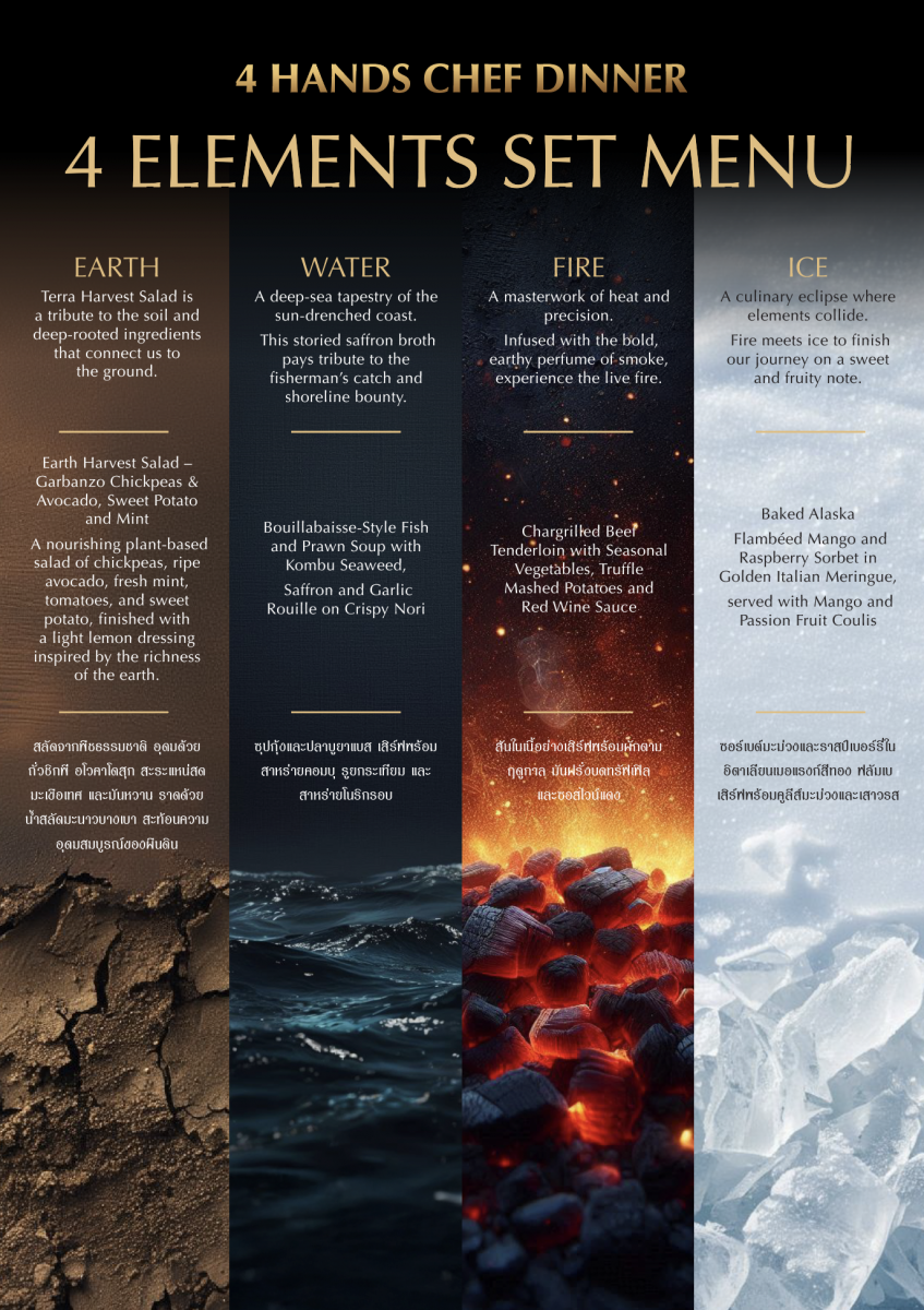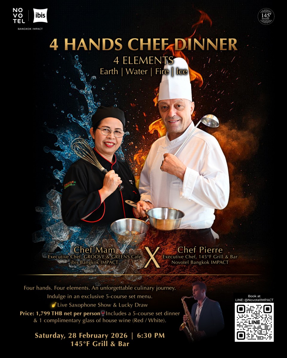 Step into an exclusive evening of culinary artistry by Novotel & ibis Bangkok IMPACT. Chefs Mam and Pierre come together to craft a curated 5-course journey inspired by the elements – Earth • Water • Ice • Fire blending creativity, flavor, and a touch of surprise.