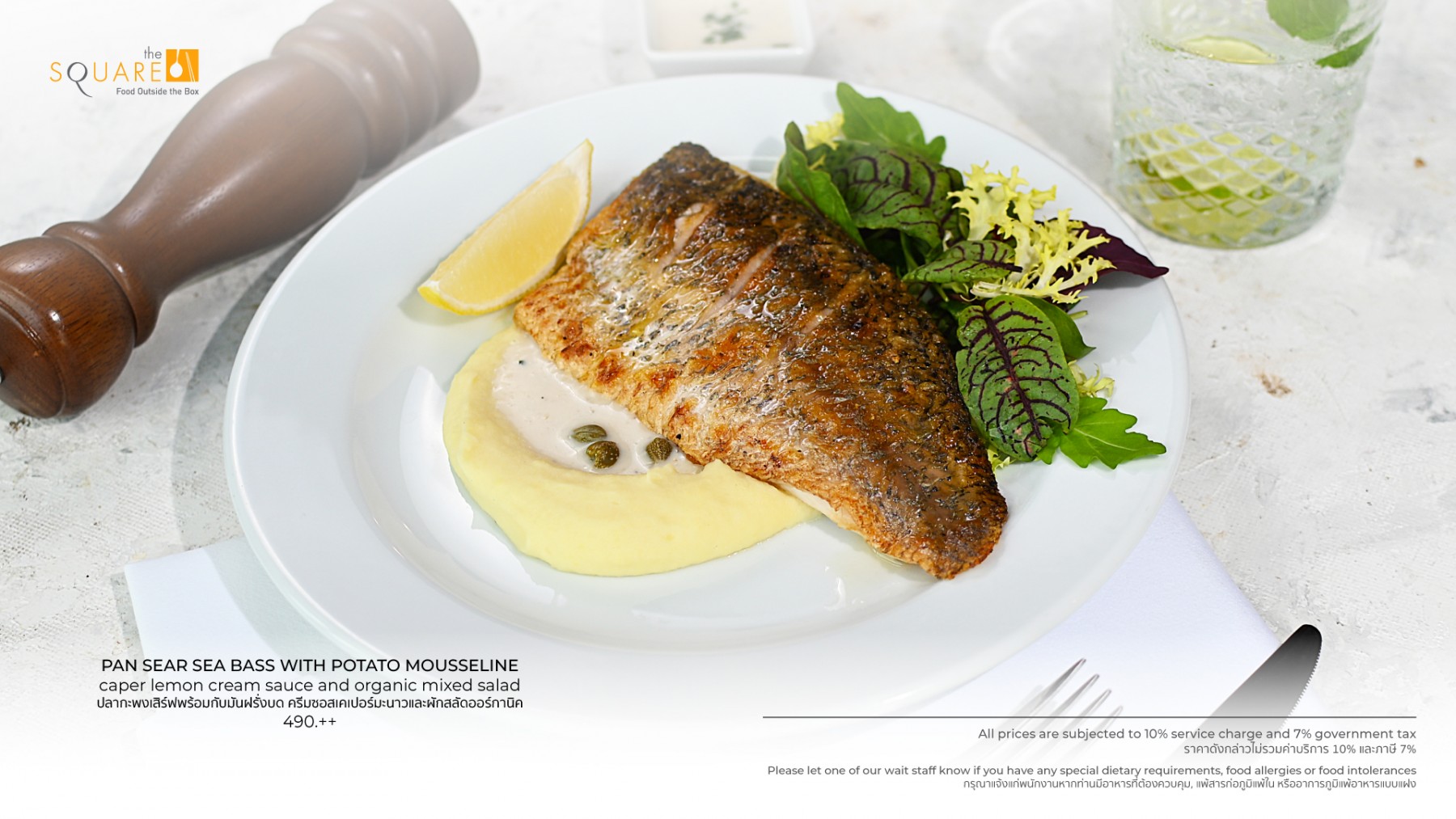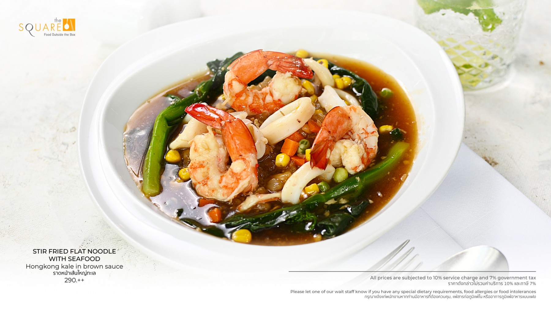 Highlights include stir-fried flat noodles with seafood and Hong Kong kale in savory brown sauce, the elegantly prepared pan-seared sea bass with potato mousseline served with caper lemon cream sauce and organic mixed salad, and a refreshing bocconcini and tomato salad with balsamic and pesto ideal for light, healthy dining.